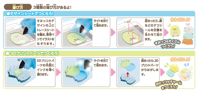 本商品は、付属の型やデザインシートを使って『すみっコぐらし』のキャラクターを作り、台座に飾ったり、チャームを作ったりすることが出来るセットです。同梱されている“マルチカラーペン”は従来の3Dドリームアーツペンと比べて全長が約4cm短く、お子様の手でも握りやすいコンパクトなサイズです。そのためインクが出しやすく、初めての方にもオススメです。ペンはキャラクターに合わせた5色がセットされています。