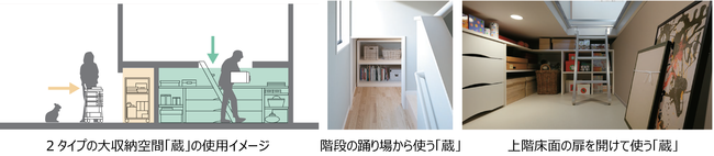 さまざまな活動を家で行うようになるなか、増えていく荷物を収納するために、各所の分散収納とあわせて、2タイプの大収納空間「蔵」を提案します。生活動線上にある、階段の踊り場から使う「蔵」には日用品や備蓄品を収納し、上階の床面の扉を開けて使う「蔵」には季節ものなどを収納。目的に合わせて使い分けることにより、日常で利用するものを適所に収納しながら災害にも備えることができます。