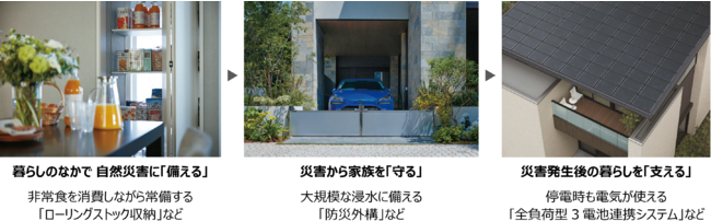 また、ミサワホームでは、頻発・激甚化する自然災害に対して、地震や浸水、風災、雪害、火災への対策を体系化した防災・減災デザイン「MISAWA-LCP」を提案しています。暮らしのなかで 自然災害に「備える」、災害から家族を「守る」、災害発生後の暮らしを「支える」。この3つのフェーズに災害対策を分類して提案します。