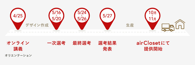 モード学園様(東京・大阪・名古屋)のファッションデザイン学科 高度専門士コース/ファッションデザイン学科/ファッション技術学科の学生を対象に、株式会社エアークローゼットがオンライン講義を実施し、デザインのルール(前提条件)を提示します。提示したターゲットのニーズに沿ったデザインを作成していただきます。その後、モード学園の教師とエアークローゼットのバイヤーによる選考を行い、最終選考を通過した計8点のデザインを生産し、『airCloset』のお客様のもとにお届けします。