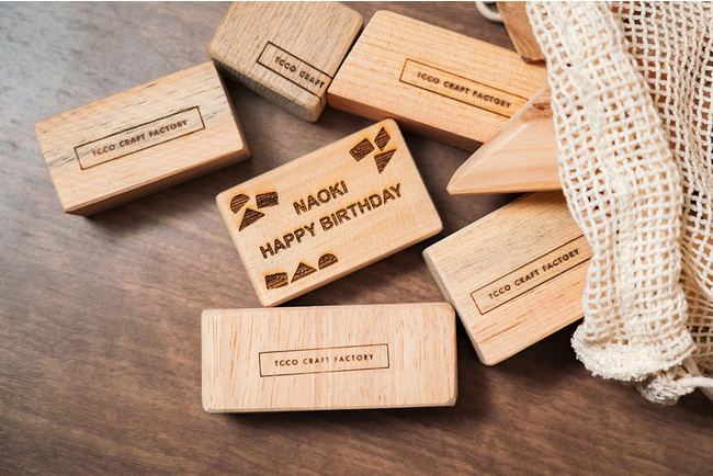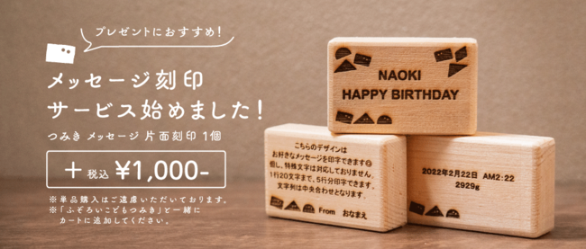 今回登場したメッセージ刻印サービスは、そんな想いのこもった「ふぞろい こども つみき」をギフトにも使って欲しいという考えから企画。従来の積み木セット(30個入り)にメッセージ入りの積み木が1個同梱されます。