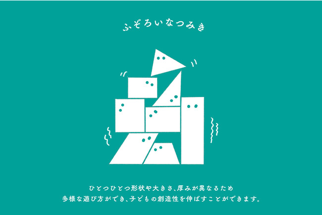 「ふぞろい こども つみき」の形状はあえて三角形や四角形、台形などふぞろいな形にしています。ヒトにもそれぞれに異なるいろんな個性がありますが、この積み木ではそんな多様性のある世界を表現。ひとつひとつ形状や大きさ、厚みが異なるため多様な遊び方ができ、子どもの創造性を伸ばすことができます。