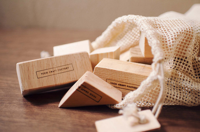 大阪の工務店が、建築現場で毎日大量に生じる余剰材を破棄することなく有効活用できないかという想いから企画した、遊ぶことでSDGs教育にも役立つふぞろいな形の子ども用積み木セット「ふぞろい こども つみき」。