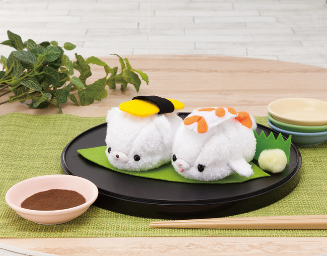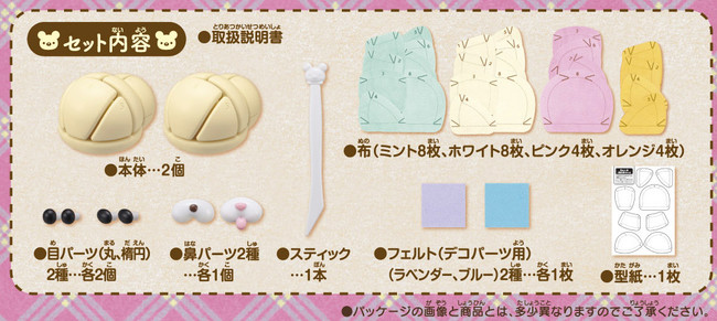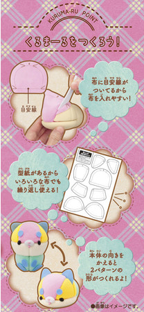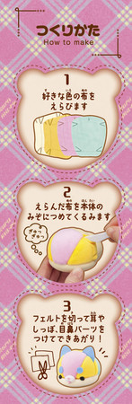 本商品は、付属の布やフェルトを使用し、本体にスティックで押し込むだけで簡単に可愛いマスコットを作ることができます。最後に、フェルトを切って耳やしっぽをつけて、目や鼻のパーツを好きな場所にさしてできあがりです。横向きや仰向き等、色々なポーズにもなります。