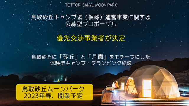 本コンソーシアムは鳥取砂丘を舞台に、宇宙・地域・未来をコンセプトとした「TOTTORI SAKYU MOON PARK 鳥取砂丘ムーンパーク(仮)」を提案し、幅広い世代が楽しむことができる体験型のキャンプ・グランピング施設を整備、運営いたします。2022年の7月に基本協定及び貸付契約の締結がされた後に、9月に現在の施設等の引渡しが行われ、その後施工・整備が入り、2023年春の開業を目指します。