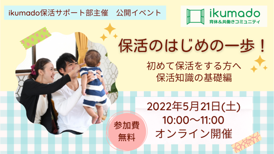育休&共働きコミュニティikumado(イクマド)を運営する株式会社COEOは、これから保活を始めるママ・パパの方向けに、「保活のはじめの一歩!保活知識の基礎編」イベントを2022年5月21日(土)にオンラインにて開催します。