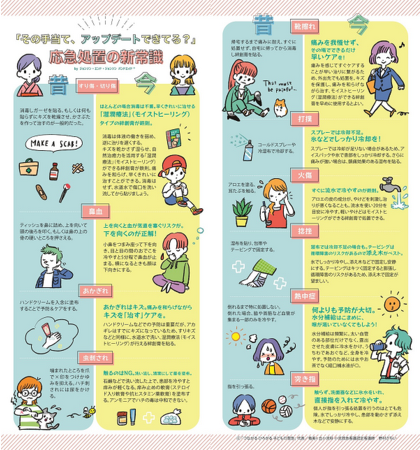 この一覧表は日頃よりお子さんとその保護者の方々のキズケアの現場に向き合い続け正しい情報の発信を 行い続ける「つながる ひろがる 子どもの救急」 代表/竜美ヶ丘小児科 小児救急看護認定看護師 野村さち い氏に監修・解説を頂き、バンドエイドブランドと共同で開発しています