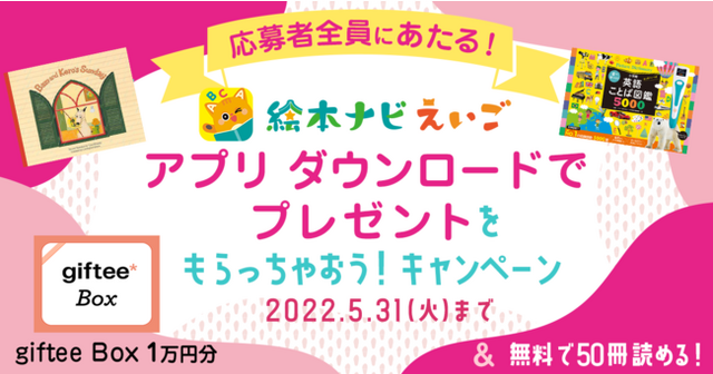 絵本の情報・通販サイト「絵本ナビ」を運営する株式会社絵本ナビ(本社東京都新宿区/代表取締役社長CEO 金柿秀幸、以下絵本ナビ)は、英語学習アプリ「絵本ナビえいご」のリリース1周年を記念して、5月31日(火)までの期間中、プレゼントキャンペーンを開催します。