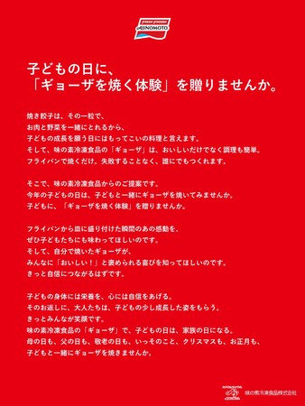 味の素冷凍食品株式会社(社長:黒崎正吉 本社:東京都中央区)は、「ギョーザ」を通して食を学ぶ、Web教育番組「ギョー育TV」を、「こどもの日」や「母の日」など家族のイベントに合わせ、当社公式YouTubeチャンネルにて公開します。4月28日(木)に公開された「何も読まずに宣誓するぞ!」篇に続き、5月5日(木)の「こどもの日」に先駆け、「子どもってすごいこと言うね!」篇を5月2日(月)より公開します。