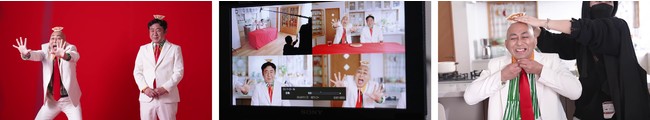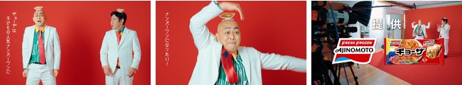 小さい餃子を頭に乗せ、様々な具材をイメージした可愛らしい衣装に身を包んで登場した錦鯉のおふたり。「ギョーザ」が“子どもの好きな料理NO.1”を目指すことを宣言する「何も読まずに宣誓するぞ!」篇から撮影が始まります。長谷川さんのお決まりの名セリフ「こーんにーちわー!」を「ギョ―育TV」バージョンにアレンジし、「ギョーんにーちわー!」と圧巻のボリュームと迫力で披露した長谷川さん。監督も「最高です!」と大絶賛でした。途中、頭の餃子の位置がズレることが気になる長谷川さん。「ギョ―ポジ(=餃子のポジション)」というワードも生まれ、「髪の毛が無いからズレるんだよ!」と現場の笑いを誘っていました。