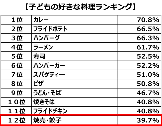 2022年4月に3歳~12歳の計600人の子どもを対象に行った「子どもの好きな料理」に関する調査では、餃子は“12位”という結果でした(当社調べ)。