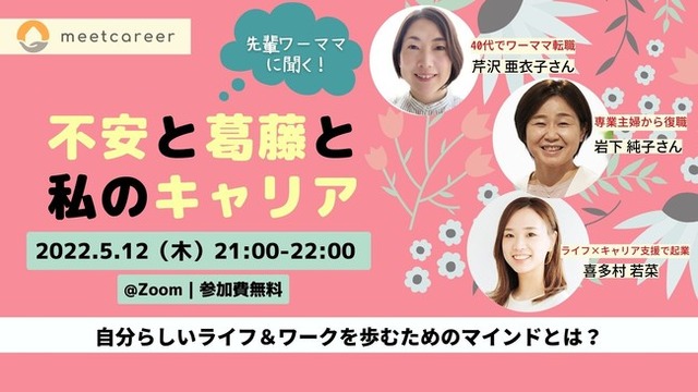 オンラインキャリア相談サービス「ミートキャリア(meetcareer)」(運営会社:株式会社fruor、本社:東京都港区、代表取締役 CEO:喜多村 若菜)では、ライフステージの変化を機にキャリアに悩む女性が多いことから、2022年5月12日(木)21:00~、無料オンラインイベント「先輩ワーママに聞く『不安と葛藤と私のキャリア』」を開催します。