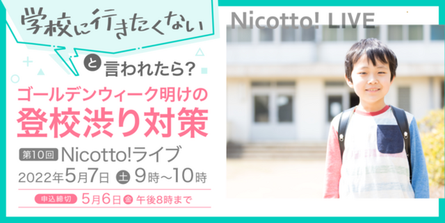 このように、なんと回答者の82%が「登校しぶり」を経験しており、今回5月のNicotto!ライブでは、ゴールデンウィーク明け、子どもたちが安心して過ごすために、登校しぶりについて取り扱うことといたしました。