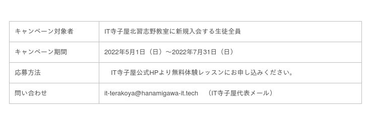 SHINATOS合同会社(本社:東京都港区 代表:江川竜太 URL:https://shinatos.com/)が運営する小中学生向けのプログラミング教室、【IT寺子屋】が【北習志野教室】限定で「入会金無料キャンペーン」を打ち出しました(2022年7月31日まで)。