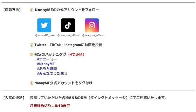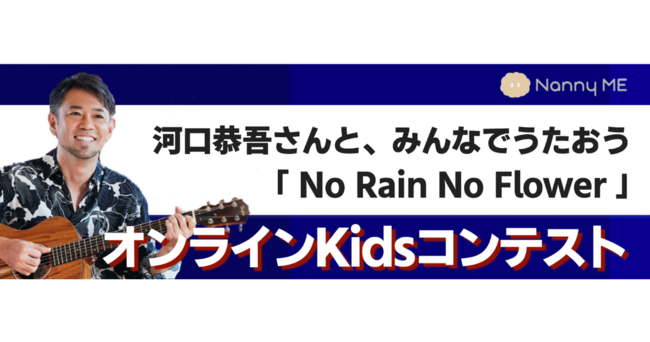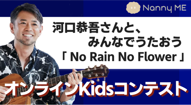シンガーソングライター河口恭吾さんの「No Rain No Flower 」を課題曲としてオンラインコンテストを行います。NannyMEのNannyと一緒に好きな表現方法で練習し、その様子を動画撮影し各種SNSへ投稿するだけで、応募完了です。最優秀賞(1組)は、「No Rain No Flower」MVで河口恭吾さんと共演できます。