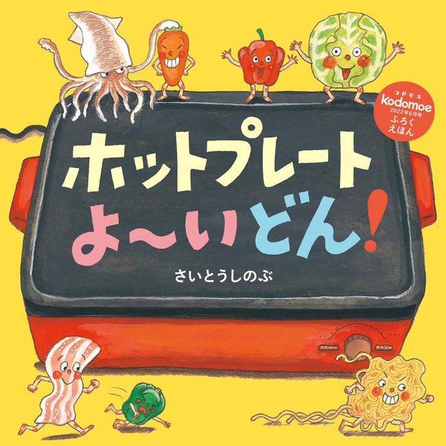 『あっちゃんあがつく たべものあいうえお』(リーブル)やコドモエのえほん『じかんだよー!』でおなじみ、さいとうしのぶ最新作。コロナ禍もあって人気沸騰中の「ホットプレート」を舞台に、おいしいレースが始まります♪