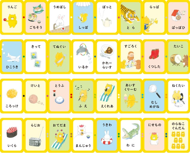 文字が読めなくても遊べる「しりとりカード」と、パズルや自由な道つなぎが楽しめる「みちつなぎカード」のセット。全部で32枚。