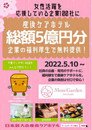 株式会社マムズ(本社:東京都新宿区、取締役社長:斎藤睦美)は、日本最大の産後ケアホテル マームガーデン葉山(神奈川県 横須賀市)を2021年12月にOPEN。今回、女性活躍や男性の育児参加を応援している企業の従業員様に100社に100泊ずつ、計1万泊・総額5億円分を企業の福利厚生としてプレゼントいたします。カラオケパセラやホテルを運営するNSグループでは、男性育休の取得率も100%となっており、企業における育児サポートの重要性を推進しています。今回のキャンペーンの経緯は、産後直後に「産後ケア」を受けることを、世の中の当たり前にするためにも、企業の福利厚生として導入をしていくことを決めました。“出産”における福利厚生として、産休や育休、お祝い金、保育園のサポートなどを行っている会社も増えてきた一方、サポートとして手薄になっているのが「産後直後のサポート」。産後ケアホテルは、産後直後のママと赤ちゃんが、体と心を休める専門のケアホテルです。自社社員、そして今回は自社社員の2親等以内(子ども・孫)まで利用枠を広げご利用出来ますので、是非奮ってご応募下さい。