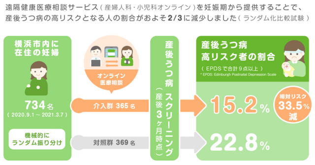すなわち、妊娠中からオンライン医療相談を提供されていたグループでは産後うつリスクが相対的に33.5%低かったことが示されました。