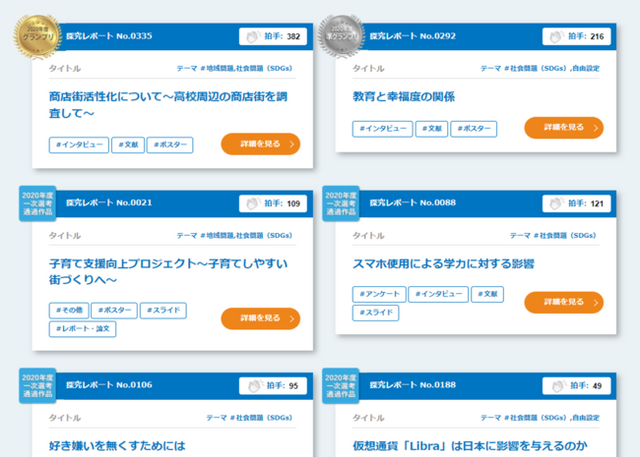 本ライブラリは、中高生の探究実践レポートを「テーマ」「調べ方」「発表形式」ごとに検索・閲覧ができ、探究の課題の設定をするうえで、全国の中高生の探究を参考にすることが可能です。