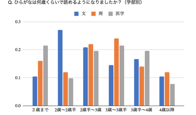 3歳までにひらがなが読めるようになった現役東大生は、文系学部は58.2%、医学部を除く理系学部は50%、医学部は50.9%でした。