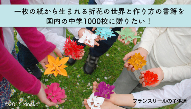 そこでこの度、「折花」の基本的な作り方に加えて、高度な芸術作品もいくつか紹介する書籍『折花』を出版し、千校の中学校に届けるための印刷資金の募集をクラウドファンディングサイト「READYFOR」にて開始することにしました。(今回のクラウドファンディングの100万円に関しては編集作業などの経費は含まず、単純に印刷費と発送経費を予定しています)
