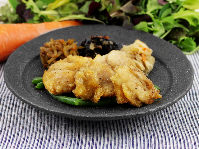 定番の塩から揚げを鶏もも肉でご用意いたしました。シンプルですが、あっさりした塩味のから揚げは食べ出したら止まらないおいしさです。