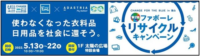 フューチャーシティ ファボーレ(富山市)で、対象となる衣料品や日用品を回収し、リサイクル業者に買い取られ、その収益はNPO法人のミャンマーやベトナムでの支援活動に充てられます。