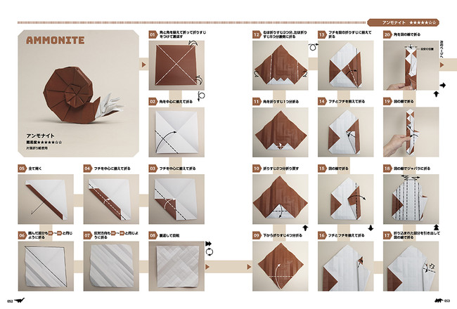 ティラノサウルス、ステゴサウルスはもちろん、アンモナイト、マンモスなど、折り紙愛好家はもちろん、恐竜・古代生物ファンも楽しめる内容になっています。