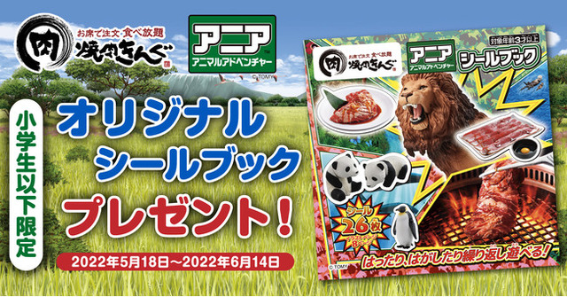 株式会社物語コーポレーション(本社:愛知県豊橋市/代表取締役社長:加藤 央之)が、全国で282店舗展開中の『焼肉きんぐ』は、2022年5月18日(水)~6月14日(火)の期間限定で、動物フィギュア「アニア アニマルアドベンチャー」(発売元:株式会社タカラトミー 以下「アニア」)とコラボレーションした、アニア「オリジナルシールブック」をプレゼントいたします。