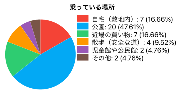 多くの子どもが週に1回以上は乗り物に乗っていました。公園での遊びの一つとして乗り物を楽しむ人が多い他、近場への買い物や散歩での移動手段としても乗り物が利用されています。いずれの場合もママ・パパが安全な場所を選び、目が届くところで乗せているようです。
