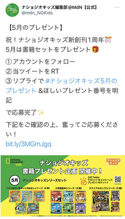 2022年5月1日~31日の応募期間に編集部公式Twitterアカウント( https://twitter.com/mdn_NGKids )をフォローしたうえで、キャンペーンツイート( https://twitter.com/mdn_NGKids/status/1520649823753744384 )をリツイート&ハッシュタグ「#ナショジオキッズ5月のプレゼント」をつけてリプライした方に、抽選でナショジオキッズの書籍をプレゼント。当選数は合計6名様です。応募規定をご確認のうえ、奮ってご応募ください。