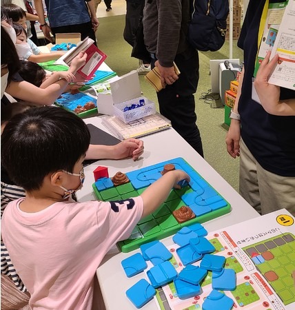 知育玩具の体験イベントでは、『宮本算数教室の賢くなるロジカルパズル』の「道をつくる」と「光の反射」を体験。子どもたちはよく考えながら、真剣にパズルに取り組み、答えを導き出していた。正解にたどり着いた時の「やったー」という歓声や子どもたちの笑顔が印象的だった。次々と高い難易度に取り組み、夢中になる姿が見られた。