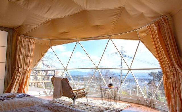 ドームテントの窓からは、矢田丘隆や大和平野を一望でき、山の隆線から昇る朝陽、照らされる街並みや雲海、季節ごとに色づく山々など日々移ろう情景は息をのむほどの絶景です。