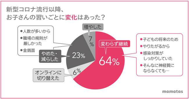 コロナ禍で習いごとを辞めたり、減らした人も23%いましたが、基本的には変化なしor逆に増やした人も。「子どもの将来のため」「本人がやりたがるから」「感染対策がしっかりしている教室に変えた」など、習いごとの時間はしっかりとキープしていました。