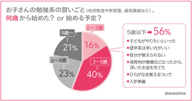 幼児教室や通信講座、英語など、勉強系の習いごとについて、56%が5歳までにスタートしていました。「本人がやりたがった」「やるなら早い方がよい」と子どものやる気や成長に合わせて、令和ママたちが上手く誘導している様子。「幼稚園のお受験のため」という理由はごく一部。受験という特別な目的がなくても、習いごとは日常の一部となっているようです。