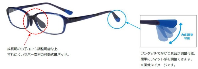 「Zoff KIDS ADJUSTABLE(ゾフ・キッズ アジャスタブル)」は、普段の授業中や体育、遊ぶ時やスポーツする時にメガネがずれやすいというお子様のために、新構造となる可動式モダン(ストッパー仕様)を搭載(※Zoff初の展開)。ずれたくない場面だけ、曲げることで、耳に沿うようになっております。素材はラバーなので、肌あたりも柔らかで快適なかけ心地。鼻あて部分には可動式のラバー素材採用で、それぞれのお顔に合わせて細部にまで調整が可能です。