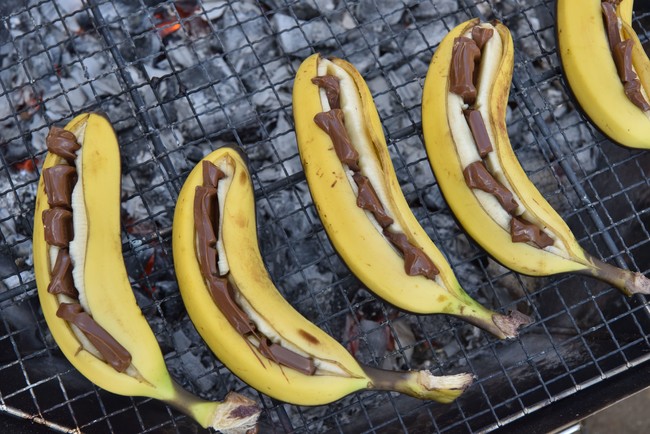 7月と8月には新たなキャンプ飯シリーズ「グリルでチョコバナナ!」が登場します。夏祭りの定番のチョコバナナですが、BUB RESORTでは豪快に炭火焼にします。一風変わったチョコバナナをご体験いただけます。