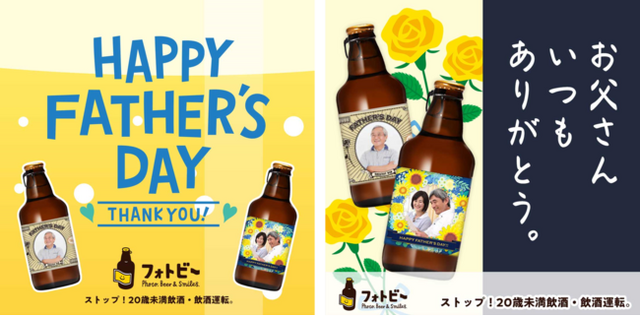 フォトビーは、お客様のスマートフォンやパソコンから、お気に入りの写真とお好きなラベルフレームやスタンプを組み合わせ、オリジナルラベルのビールが簡単につくることができるサービスです。父の日シーズンにおいては、多くのお客様に、お父さんへの贈り物としてご利用いただいています。