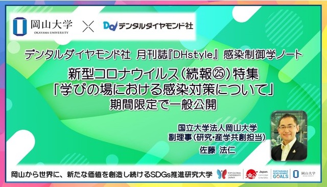 国立大学法人岡山大学(本部:岡山市北区、学長:槇野博史)東京オフィス駐在の佐藤法仁副理事(研究・産学共創担当)・URAは、歯科総合出版社である株式会社デンタルダイヤモンド社(本社:東京都文京区本郷、代表取締役:濱野優)が歯科衛生士向けに発行している月刊誌『DHstyle』に、連載「感染制御学ノート」を2012(平成24)年1月から行っています。