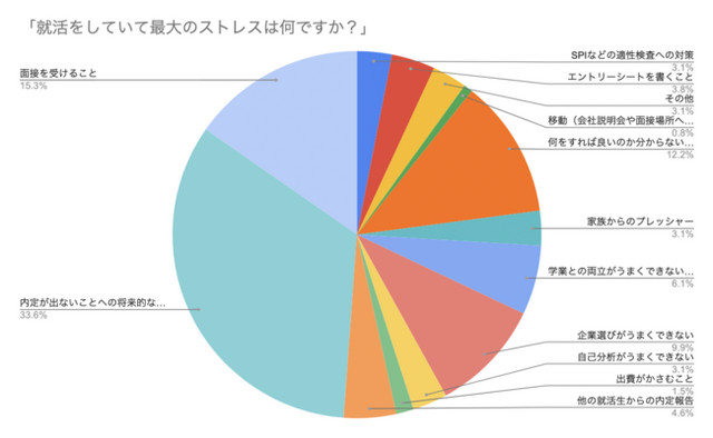 1位は「内定が出ないことへの将来的な不安」で39%、2位は「面接を受けること」で19%、3位は「企業選びがうまくできない」で10%という結果になりました。