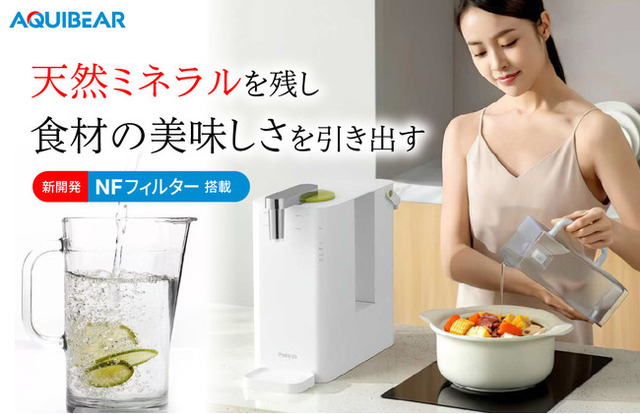「Aquibear」には2種類のフィルターが搭載され、三層のフィルターを通し0.001ミクロンまで濾過します。細菌類などの除去率は99.9%。しかし、「カリウム、カルシウム、ナトリウム、マグネシウム、ストロンチウム」といった天然ミネラルは残ります。