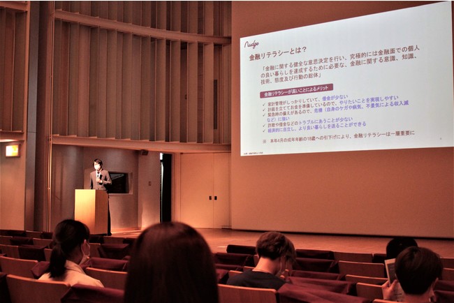 2022年4月からは成年年齢が18歳に引き下げられ、クレジットカードの使い方をはじめ家計管理や資産形成など、若年層に対する金融教育の重要性は一層高まっています。授業では、公立小松大学国際文化交流学科に所属する大学1年生約80名を対象に、クレジットカードの基本的な仕組みやその安全な使い方、投資に関する基本的な知識と考え方について、ナッジの担当者が対面で解説しました。