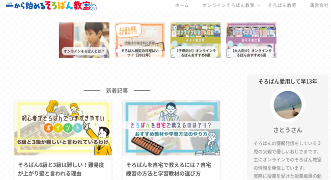 2022年5月より「1から始めるそろばん教室(https://kappakanjikanthari.com/)」の運営が、株式会社サイトクリエーション(https://sitecreation.co.jp/)に変更となりました。「1から始めるそろばん教室」では、自宅学習ができるオンラインそろばんの情報を提供しています。実際に先生がマンツーマンで子供にレッスンしてくれる教室や、配信動画を見ながら自分で学習を進めるタイプなど、幅広く紹介しています。