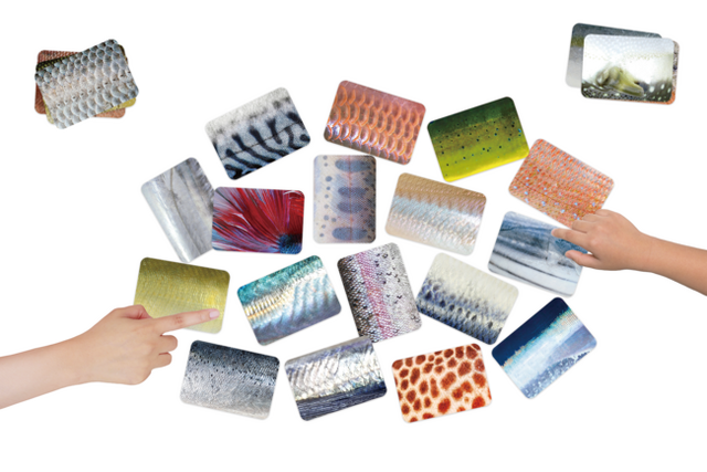 本商品は、魚のキラキラ感やウロコの凹凸感を特殊な印刷技術で再現したかるたで、見て楽しむのはもちろんの事、目を閉じて触ったり、水に浮かべて遊ぶことも可能です。