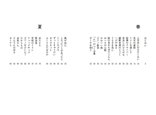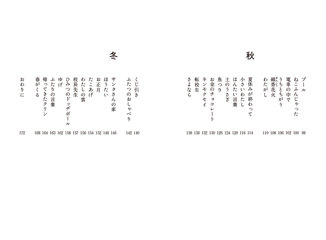 子どもならではの新鮮なモノの見方や、繊細な心の動き、純粋なうれしさやはずかしさが、子ども目線で丁寧に描かれています。「入学式行きたくない」「線香花火」「キンモクセイ」「サンタさんの家」など、春夏秋冬で章分けされており、季節の移ろいも感じられます。