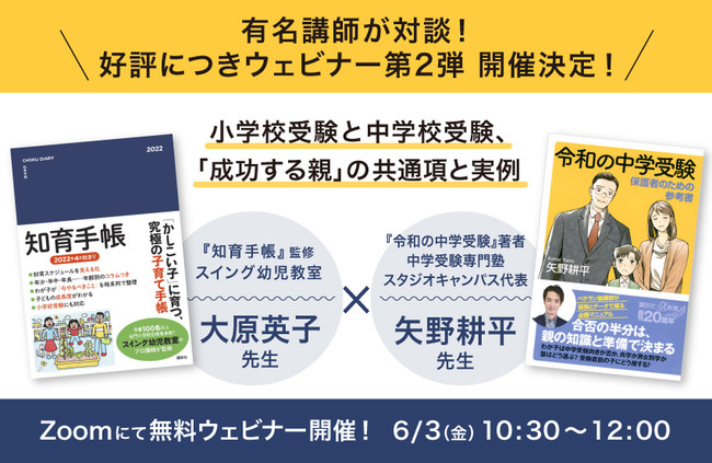 今年3月に開催され大好評を博した、小学校受験と中学受験についての対談ウェビナー第2弾を、6月3日(金)に実施します。年齢を問わず、受験全体が激化している昨今、受験において「成功する親」にはどういう共通点があるのか。その実例についてお話しいただきます。