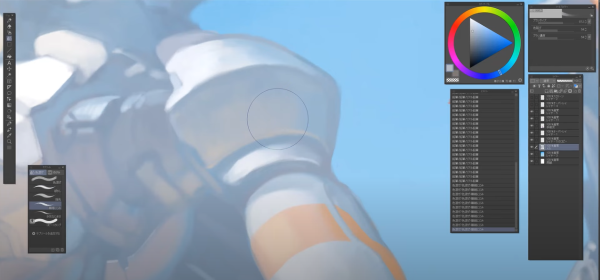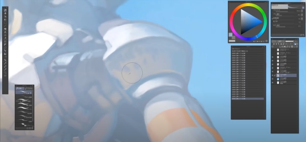 「普段は、エアブラシじゃなくて、点描みたいに描いてます。グラデーションはざっくり描いた後にぼかしツールとかで混ぜると、平面なグラデーションに多少表情が出るんです。混ぜるときも、細い筆で塗り重ねるような感じで描くと、濃淡が出て表情が残ります。色をたくさん使い過ぎちゃうと絵が難しくはなりますが、トーンの幅を狭めながらもいろんな色を使ってあげると、全体が華やかな感じに仕上がります。」