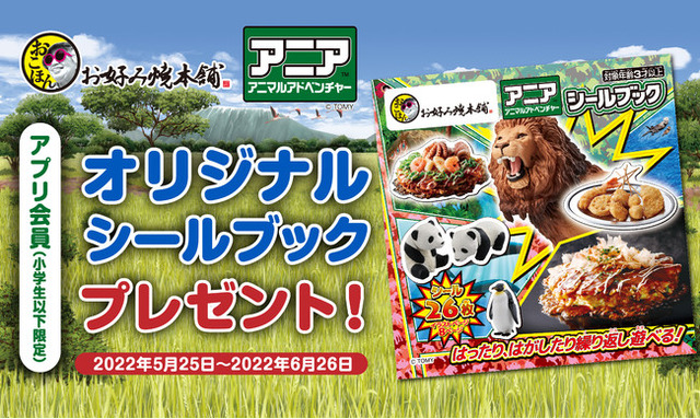 株式会社物語コーポレーション(本社:愛知県豊橋市/代表取締役社長:加藤 央之)は、全国26店舗展開中の『お好み焼本舗』にて、2022年5月25日(水)~6月26日(日)の期間限定で、動物フィギュア「アニア アニマルアドベンチャー」(発売元:株式会社タカラトミー 以下「アニア」)とコラボレーションした、アニア「オリジナルシールブック」をプレゼントいたします。