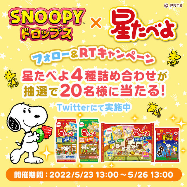 公式Twitter、「スヌーピードロップス」と「ばかうけ&星たべよ」の、両方のアカウントをフォローして、5月23日に投稿されるキャンペーンツイートをリツイートした方の中から抽選で、20名様に「「星たべよ」4種詰め合わせ」が当たります!